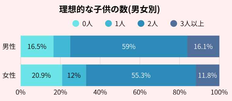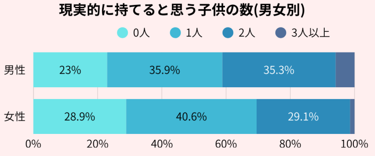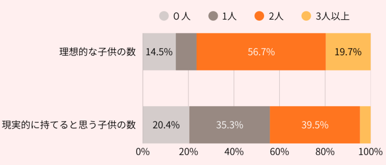 出産への意識調査で理想的な子供の数は2人が最も多く、全体の76.4%が2人以上を持つことを理想として考えています。でも、現実的に考えるとのそ割合は少し変わってきます。半数近くは0人もしくは1人までがしっかりと育てられると感じています。