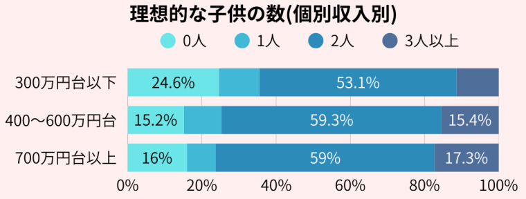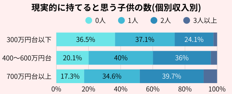 年収700万円台以上の場合では、76.3%が理想は2人以上とする一方で、現実的には2人以上持てると回答している人は48%にとどまっている。