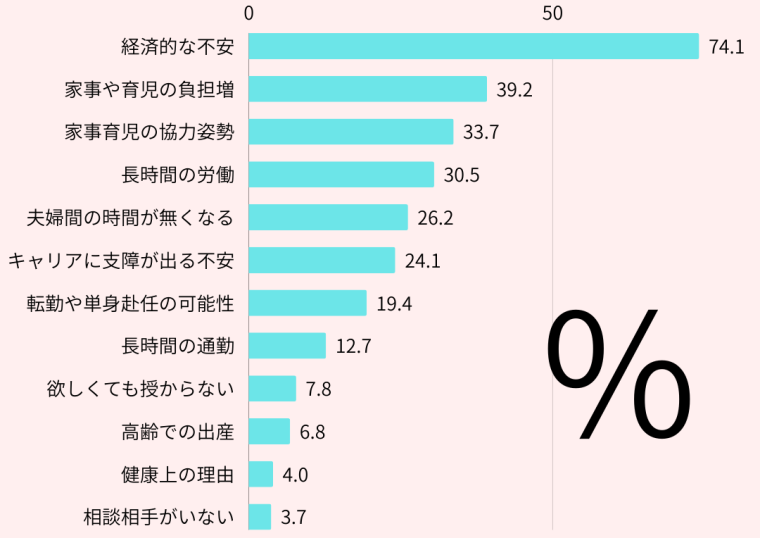 理想的な子供の数と現実的な子供の数で差異が生じる理由としては多くに人が経済的な不安を74.1%と高くなっています。その次が育児や家事に対するモノで合わせると約70%になります。経済的な不安では男女で大きな差はなく、最も大きなハードルとなっています。