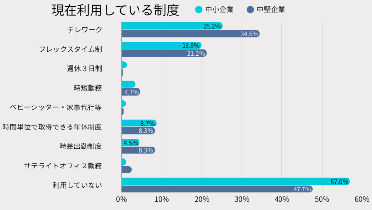 でも、実際には「テレワーク」「フレックスタイム制」を利用しているのは半分の割合で多くは「利用していない」は40%近くと多いです。