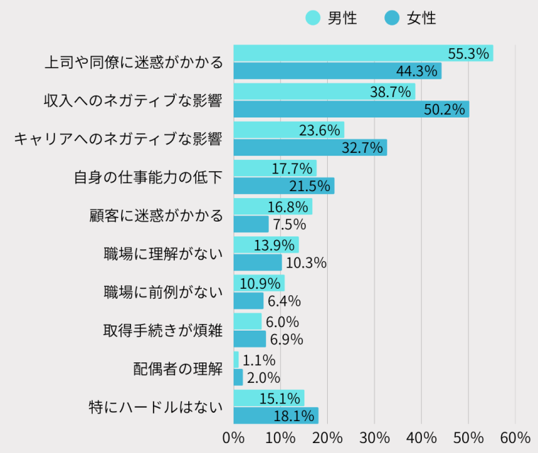 こちらのグラフでは男性の1位が「上司や同僚に迷惑がかかる」が55.3%で女性の1位は「収入へのネガティブな影響」となっています。女性に限ってはキャリアの影響と収入の影響が結びつくことで約80%の人はここを諦めて半年以上の育休を取得していることが分かります。