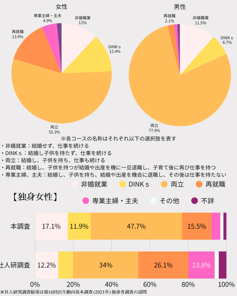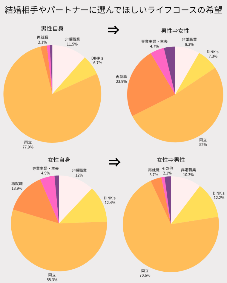 その反対に女性が男性に求めるのは両立が全体の70%を占めています。その結果を男性自身と女性自身のグラフに重ねると、ほとんど変わりはありません。現実的に男性・女性双方がお相手に希望しているライフステージが重なった形になっています。